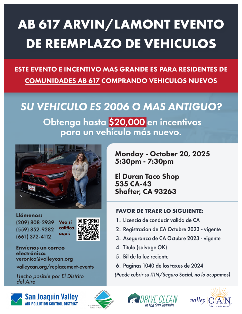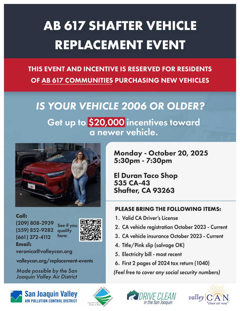 REMINDER: This event and incentive is reserved for residents of AB 617 communities purchasing new vehicles.At this time, we are no longer accepting new Clean Cars 4 All vehicle replacement applications, except for residents in designated AB 617 communities. We are deeply grateful for the overwhelming response and continued support from our community as we work together to improve air quality and expand access to clean transportation in the San Joaquin Valley.For future updates, please stay connected with us at www.valleycan.org and follow us on social media.