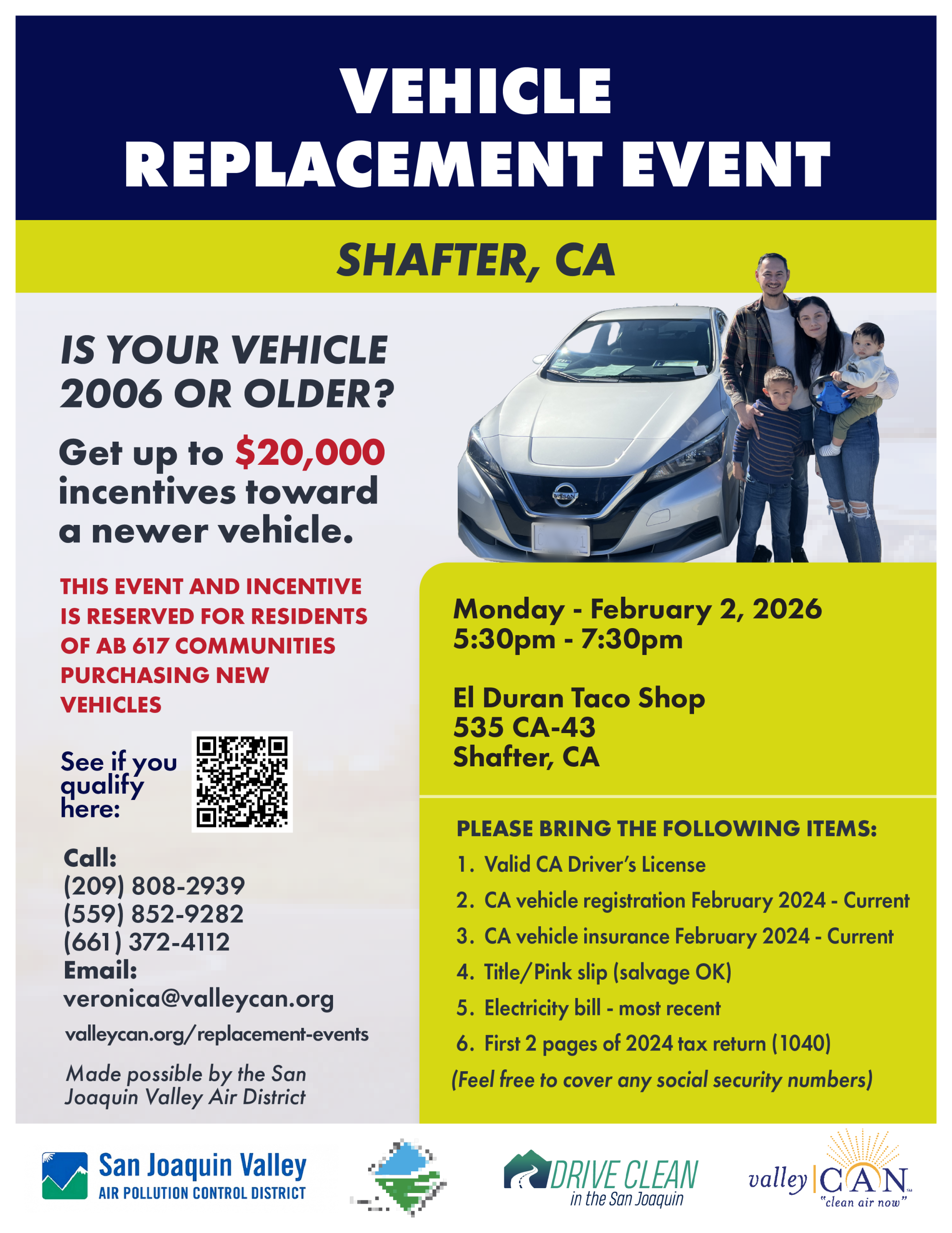 REMINDER: This event and incentive is reserved for residents of AB 617 communities purchasing new vehicles.At this time, we are no longer accepting new Clean Cars 4 All vehicle replacement applications, except for residents in designated AB 617 communities. We are deeply grateful for the overwhelming response and continued support from our community as we work together to improve air quality and expand access to clean transportation in the San Joaquin Valley.