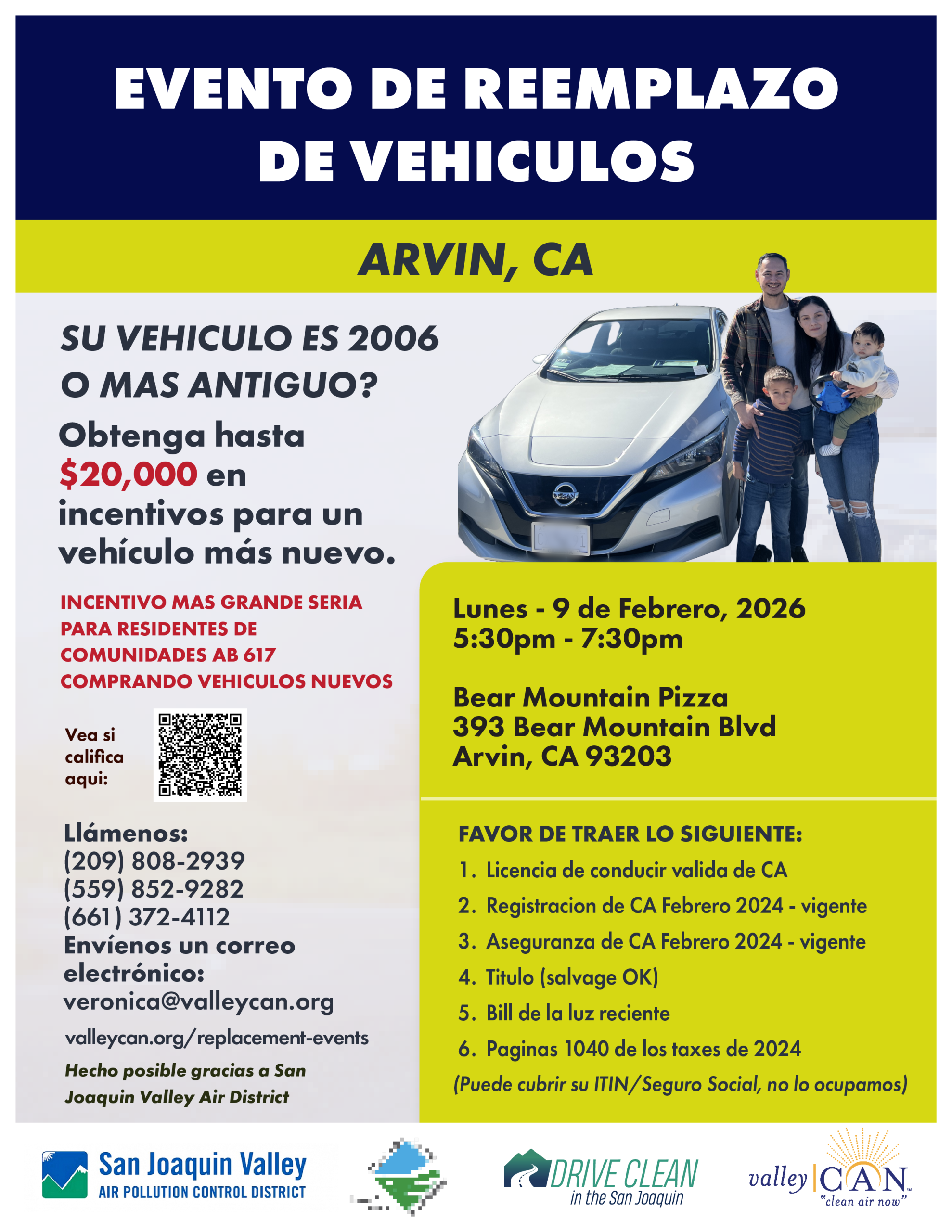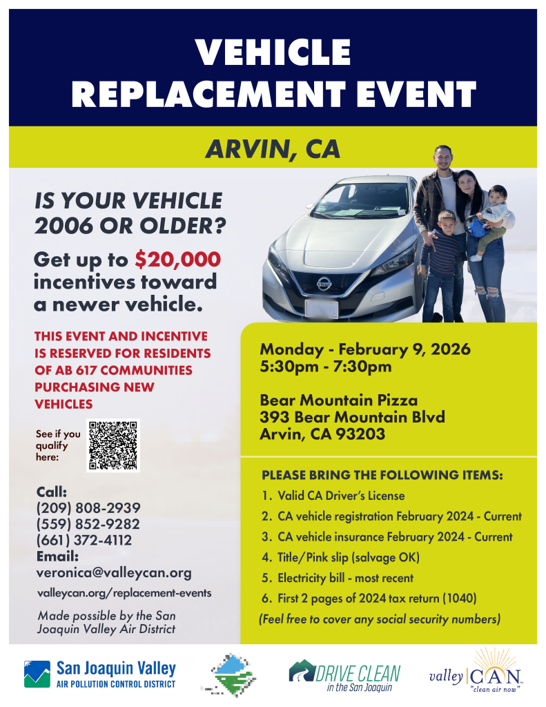REMINDER: This event and incentive is reserved for residents of AB 617 communities purchasing new vehicles.At this time, we are no longer accepting new Clean Cars 4 All vehicle replacement applications, except for residents in designated AB 617 communities. We are deeply grateful for the overwhelming response and continued support from our community as we work together to improve air quality and expand access to clean transportation in the San Joaquin Valley.