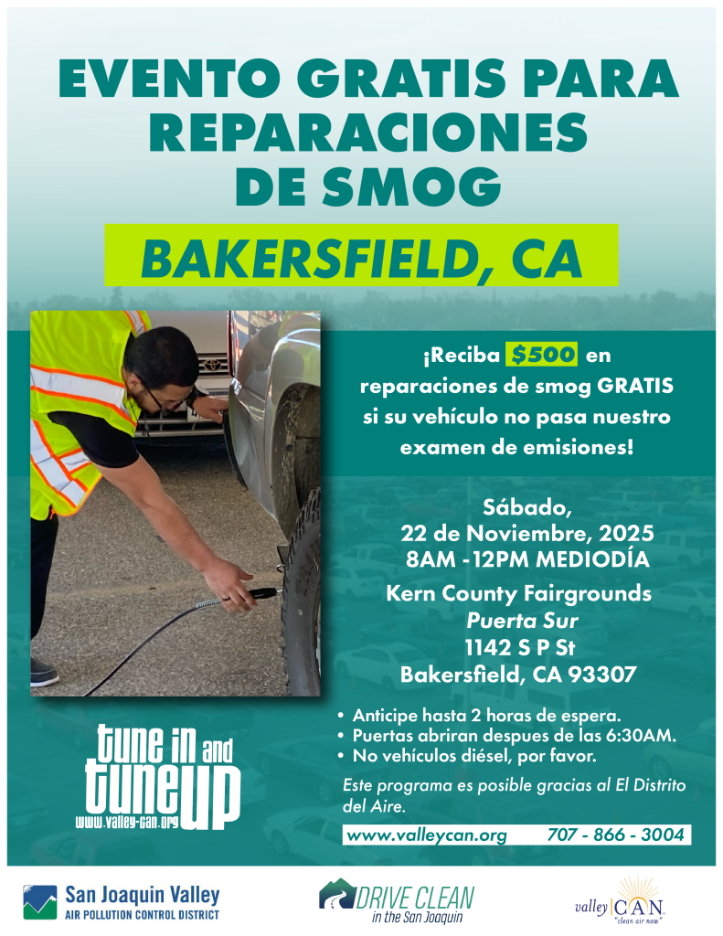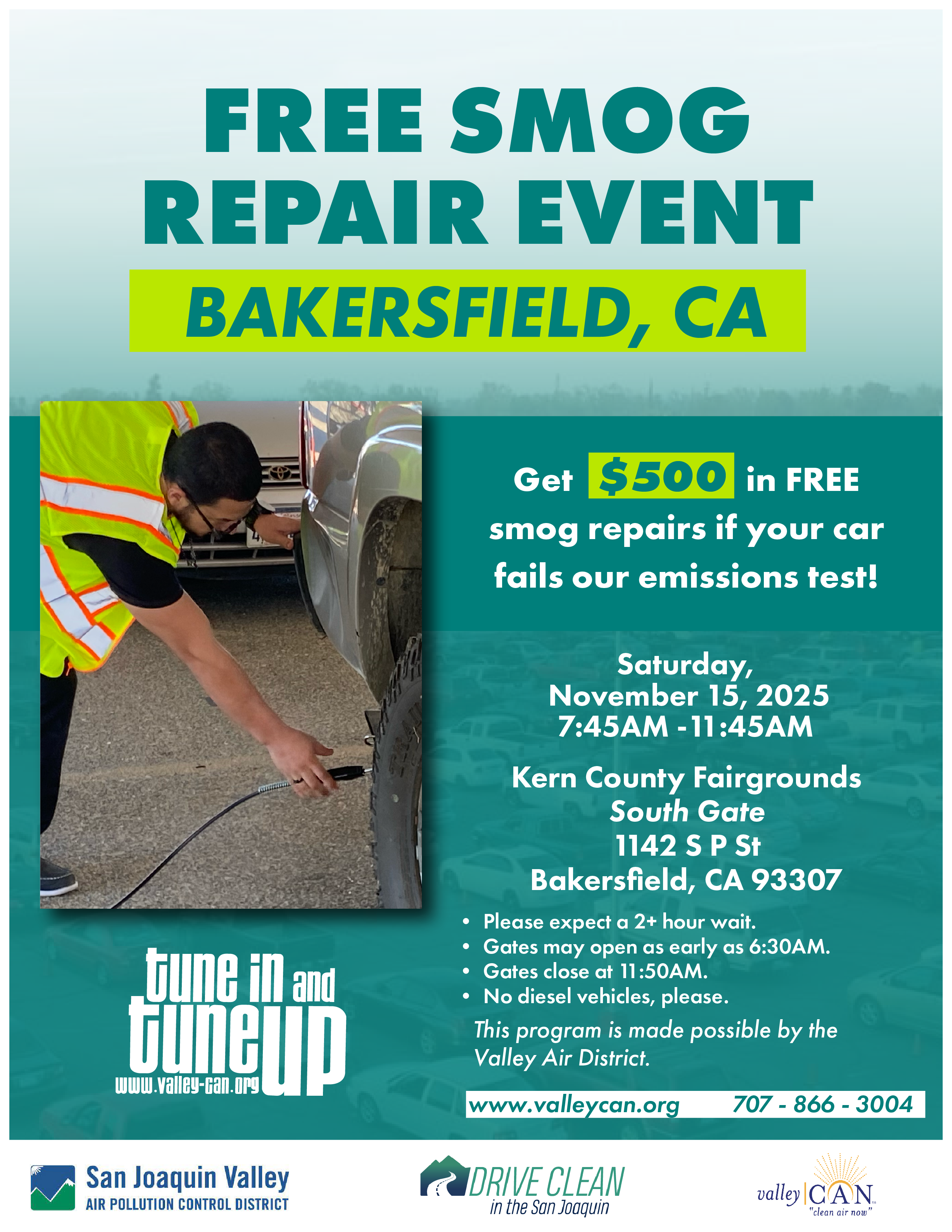 If you are a San Joaquin Valley resident and you think your vehicle is in need of smog related repairs, bring it to the next scheduled Tune In & Tune Up in your area for a free emissions test.